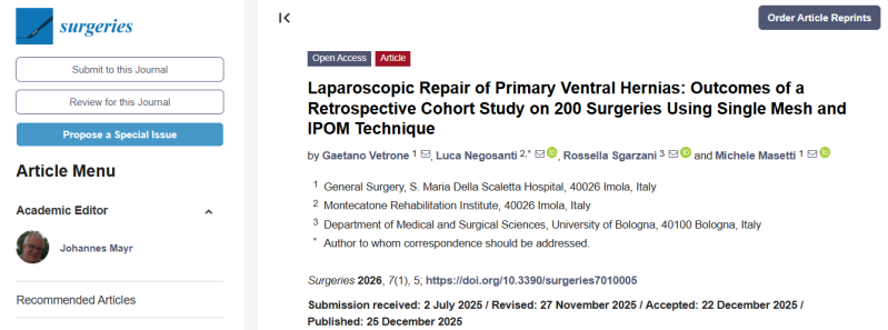 - Vetrone et al. Laparoscopic Repair of Primary Ventral Hernias: Outcomes of a Retrospective Cohort Study on 200 Surgeries Using Single Mesh and IPOM Technique. Surgeries 2026, 7(1), 5; https://doi.org/10.3390/surgeries7010005